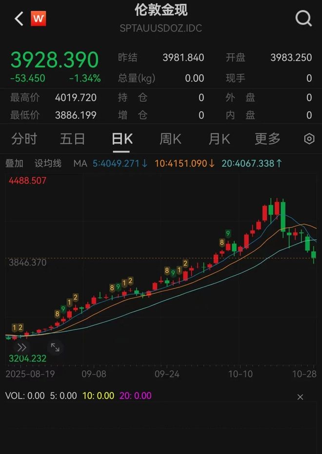 10月28日,黄金再次下跌。盘中,股价一度跌逾2%,连续跌破4000点、3900点,最低触及3886点。从高点算起,金价六个交易日暴跌11.3%,从4400点附近回落,一度跌破3900点。 首先,对于黄金股下跌的猜测过多。在崩盘之前,黄金今年已上涨 66%,成为仅次于韩国股市的第二大资产。其次,俄罗斯和乌克兰冲突接近停火,大国竞争明显缓和,中美利好消息不断,对黄金不利。第三,黄金暴跌,获利了结、卖空,充斥市场。据文化金融统计,当日大宗商品市场资金大量回笼,净流出37.73亿元。其中,贵金属板块是最大的基金销售类别。上海黄金、上海银行分别遭遇55亿元、22亿元巨额资金流出,再次引发重大危机。在金价暴跌之前,许多金融机构都看空。花旗集团以全球市场状况变化为由,将未来三个月的黄金价格预期从每盎司 4,000 美元下调至 3,800 美元,将白银价格预期从每盎司 55 美元下调至 42 美元。洪浩认为,指数级金银泡沫的破裂很难在一夜之间压平,因此跌幅会很严重。处于历史高位的黄金也不再是避险资产。对于黄金的后市,洪浩认为,还是耐心等待金银探底,避免短期内出现强劲的技术性反弹。这是黄金的短期看跌趋势。中国和泰国首席经济学家李顺雷坚决看好十多年来一直看涨黄金,但最近转为看跌(截至 10 月中旬)。 “我认为我们需要小心,”中国台湾国际首席经济学家李洪雷在“Open Mind”视频播客上警告说。 “贵金属在一年内上涨超过 50% 是非常不寻常的,所以我认为最好不要参与这次热潮。”最大的黄金卖空者表示,金价可能跌破3500美元。凯投宏观分析师近日表示,上周的下跌是下跌趋势的开始,今年金价的大部分涨幅都来自于金价。他表示,有可能被取消。凯投宏观首席经济学家约翰·希金斯表示,这很大程度上是因为2025年金价的上涨似乎是由“害怕错过”推动的,而今年支撑金价的因素是涨幅有限。凯投宏观下调了对金价的预测。希金斯表示,到明年年底,金价可能会跌至每盎司 3,500 美元。这我这意味着金价较目前水平下跌超过 12%。不过,也有许多机构持看涨立场。摩根大通分析师格雷戈里·希勒(Gregory Shearer)上周在一份报告中表示,投资者的获利回吐将被包括央行在内的其他实物买家的“强力买盘”所吸收,任何价格下跌都将相对有限。希勒希望明年第四季度黄金平均价格达到 5,000 美元。高盛表示,美联储降息以降低美国国债收益率的可能性、持续的经济不确定性以及美元疲软表明金价将在今年年底和2026年继续上涨,尽管金价可能会测试4,000美元左右的支撑位。高盛已将2026年第一季度金价目标设定为4,440美元,并将在今年晚些时候进一步上调。明年第四季度,价格将从 4,900 美元上涨至 5,055 美元。然而,在最近一段时间里,金价强势反弹,跌幅不足0.5%,收复3950点。