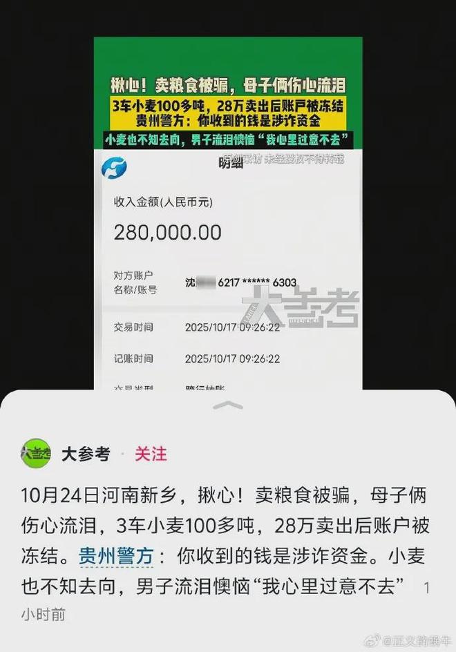 10月24日,豫北平原秋花初开。在河南省新乡市的一个粮食基地,忙碌了6个多月的母子俩在收获后满脸笑容地完成了粮食的运送。然而,手机银行的提示音却让他的笑容凝固了。该账户因“非法资金”被冻结。三辆满载小麦的卡车已经出发。购买100多吨五谷杂粮支付的28万元,本应用于明年春天的种植费用和家里的过冬储备,但现在却成了警方所说的“诈骗资金”。当时,母子俩无法理解,自己只卖了几单位小麦,怎么就陷入了“骗局”。他们万万没想到,六个月辛苦筹集的28万元,竟然变成了需要冻结调查的涉案资金。在过去,所谓“深海捕鱼”的对象是资本数亿美元的大公司,交易金额数千万、数亿美元的账户很常见。但现在这个网络可以延伸得越来越远,甚至到达农民。靠天吃饭、靠地吃饭的普通人,都难逃被“抓捕”的命运。母子俩听到天气极冷的消息,当场崩溃。眼泪落在散落的麦秆上,留下一丝无奈。据附近一位粮商回忆,母子俩常年在当地收粮卖粮。他们都是诚实的人,粮食也好。日前,一位自称“外地粮商”的采购爱好者主动联系了他。由于价格合理,双方很快达成了协议。 10月24日一早,他们租了一辆卡车,装了更多的东西。汉小麦100吨。看着卡车远去,他们才松了口气。下午,28万元货款如期到账。母亲计划为儿子购买农具,儿子计划还清债务。一切都在向好的方向发展。直到晚上,银行打来的电话打破了沉默。 “因涉嫌电信诈骗案,贵州警方依法冻结了其账户。”本以为是诈骗电话,但经过反复核实,发现买家竟是洗钱组织成员,沦为“工具店”。 “从春天的播种、打农药,到秋天的收割、晒晒,每一件事都让我流汗!”妈妈泪流满面。我的儿子悲痛欲绝。我抓起一张皱巴巴的测量表,蹲在房间的角落里,用手指轻轻地擦过“102.3吨”的行。 “食物没了,钱也被冻结了。我们怎么办?”今年河南部分地区遭遇干旱,这块小麦几乎占了家里全部积蓄。这并不是特例。山东省阳谷市、河南省新乡市等地也发生过类似事件,诈骗团伙利用诈骗资金购买大量粮食、黄金、玉米等产品,然后倒卖套现,洗钱。 资金。他的重点是“大量交易、大量现金需求和监督”之间的联系,最无辜的受害者往往是诚实和负责任的农民。法律专家指出,虽然刑事诉讼法允许警方冻结涉案账户,但最高人民法院、最高人民检察院、公安部联合司法解释也明确规定“如果其他人 善意非法取得财产的,不予追回所谓“诚信”,需要满足三点:不知情、价格合理、交割完整。真吾母子交易完全符合这个标准。但现实中,类似的“诚信第三方”还很多。问题:一个人卖黄金,被诬陷诈骗,无罪却被扣8万元。有人卖粮食,取保候审, 尽管交易合法,却陷入了诉讼。 “你不能仅仅为了补偿一个受害者而创造新的受害者,”律师有气无力地说。 《公安机关办理刑事案件程序规则》规定,与案件无关的资产可以在三日内解冻,但现实中往往需要几个月的时间,有的甚至需要半年的时间。律师建议母子俩收集交易文件, 称重指示、汇款记录、村委会证明证监会尽快向贵州省案件管理机构提交证明这28万元是合法出售粮食的证据。粮站陷入一片黑暗,妈妈小心翼翼地将称重单放进包里。儿子在电话那头反复解释自己的清白。他的声音里带着疲惫,还有一种不肯接受命运的固执。 28万元对于别人来说只是一个数字。但对他们来说,今年是忙碌的一年,也是忙碌的一年。预计这起事件仍在调查中,但仍存在许多疑问。当非法资金流入正常交易链条时,法律应如何在“追赃”与“维权”之间取得平衡?真正的正义可能不在于冻结账户,而在于所有守法公民应得的和平。愿法律的伟大,不仅惩恶扬善,而且保护善行。